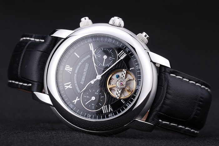 karkötő: fekete krokodil bőr heveder fehér menetes varrással és hő domborított Audemars Piguet név és logó és egy audemars Piguet írt rozsdamentes acél flip-over hook clasp
