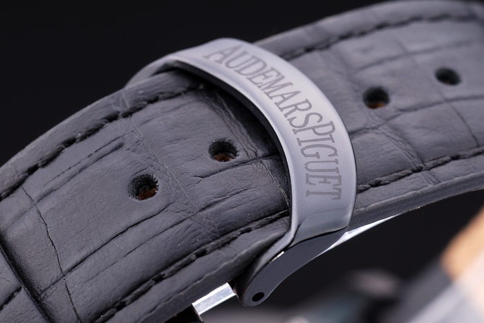 karkötő: fekete krokodil bőr heveder hő dombornyomott Audemars Piguet név és logó és egy Audemars Piguet írt ion bevonatú flip-over Hook Csapka