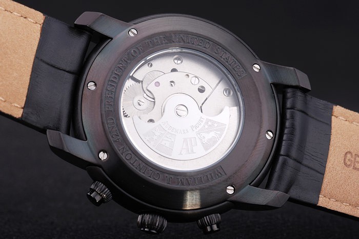 karkötő: fekete krokodil bőr heveder fehér menetes varrással és hő dombornyomott Audemars Piguet név és logó és egy Audemars Piguet írt ionnal bevont flip-over Hook Clasp