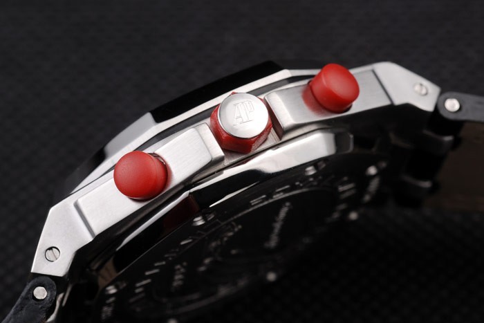 karkötő: Hőfesték nélküli Audemars Piguet fekete krokodil bőr heveder dupla piros varrással és audemars piguet gravírozott csiszolt rozsdamentes acél hajtogatott kötlevel