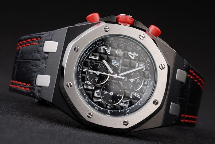 karkötő: Heat dombornyomott Audemars Piguet fekete krokodil bőrszíj dupla vörös varrással és Audemars Piguet gravírozott ion-bevonatú szeres-in csattal