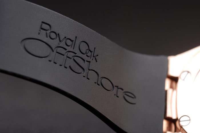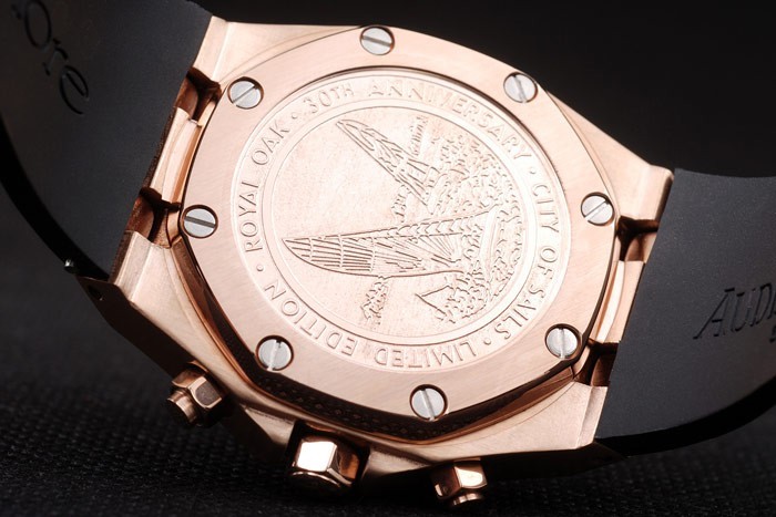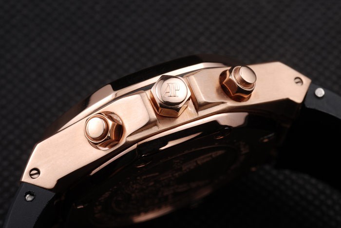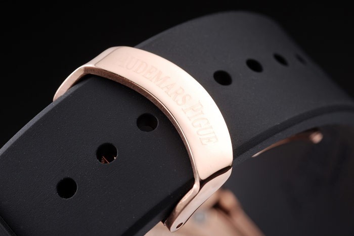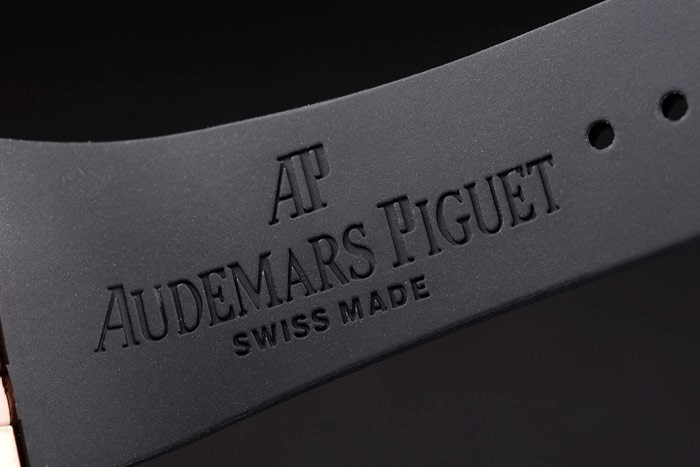 Case: Rose- aranyozott esetben katalógusa szíj: Audemars Piguet Royal Oak Offshore dombornyomott fekete gumi pánt Audemars Piguet vésett Rose- arany kinyitható zárral katalógusa karkötő hossza: 280 x 30 mm katalógusa keret: Rose aranyozott rozsdamentes acél keret Csavarja le a csavarokkal