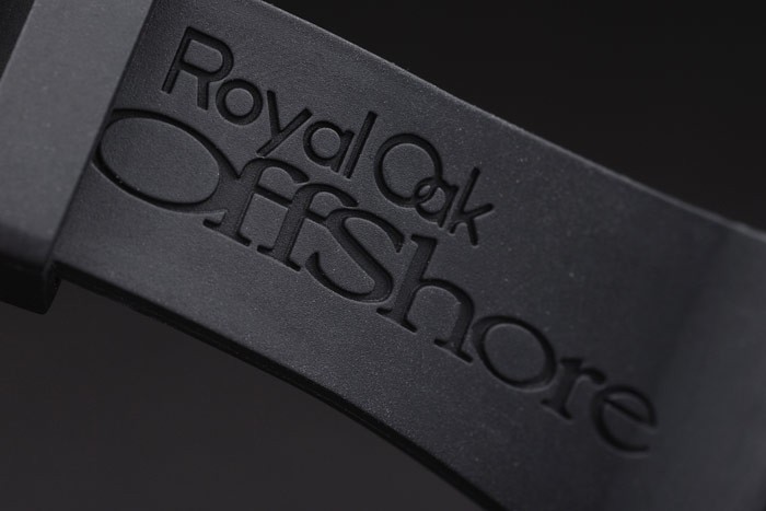 Case: Ion bevonatú rozsdamentes acél tok katalógusa szíj: Audemars Piguet Royal Oak Offshore dombornyomott fekete gumi pánt Audemars Piguet vésett ion bevonatú kinyitható zárral katalógusa karkötő hossza: 191 x 24 mm katalógusa Keret: Crystal kirakott ion bevonatú Csavarozott Beszel