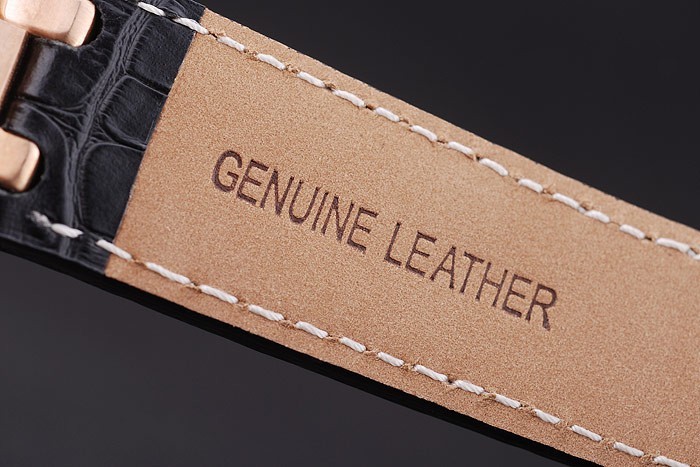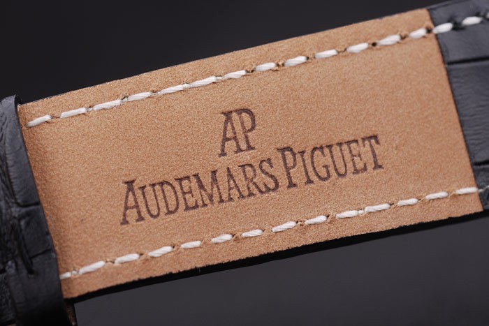 karkötő: fekete krokodil bőr heveder fehér menetes varrással és hő dombornyomott audemars piguet név és logó és egy audemars piguet írt rózsa-aranyozott flip-over hook clasp