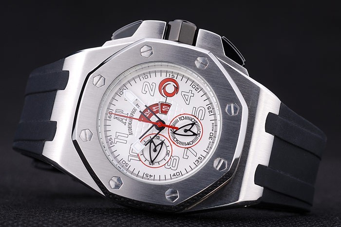 Case: Flashed rozsdamentes acél tok katalógusa szíj: fekete gumi heveder hő dombornyomott Audemars Piguet Royal Oak Offshore bélyeg és egy Audemars Piguet feliratos ion bevonatú horog csattal csattal katalógusa karkötő hossza: 220 x 28 mm katalógusa Keret: szálcsiszolt rozsdamentes acél hatszögletű becsavarva előlap katalógusa Átmérő: 45 x 38 mm-es katalógusa Watch Kapcsos: Buckle katalógusa Üveg: zafírüveg katalógusa korona: Audemars Piguet logo gravírozott ion bevonatú cutwork korona szeptemberben között egy védő fal derékszögű két Koronák mindkét oldalán