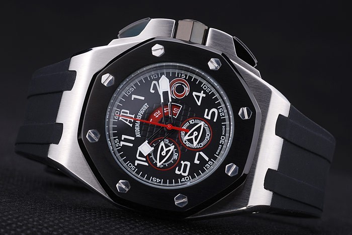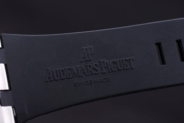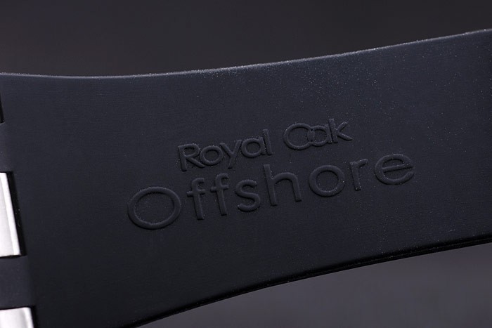 Case: Flashed rozsdamentes acél tok katalógusa szíj: fekete gumi heveder hő dombornyomott Audemars Piguet Royal Oak Offshore bélyeg és egy Audemars Piguet feliratos ion bevonatú horog csattal csattal katalógusa karkötő hossza: 220 x 28 mm katalógusa Keret: ion bevonatú Hatszögletű csavart le Betel