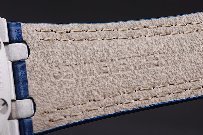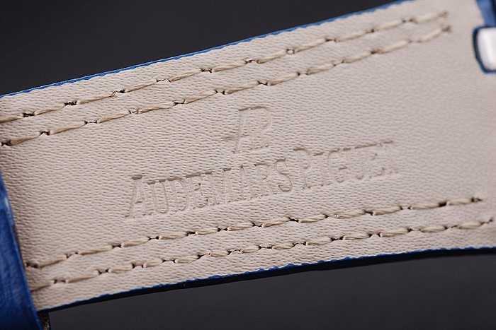 Case: Csiszolt rozsdamentes acél tok br> karkötő: kék krokodil bőr heveder dupla fehér varrással és hő domborított audemars piguet név és logó és egy audemars piguet írt rozsdamentes acél flip-over hook clasp