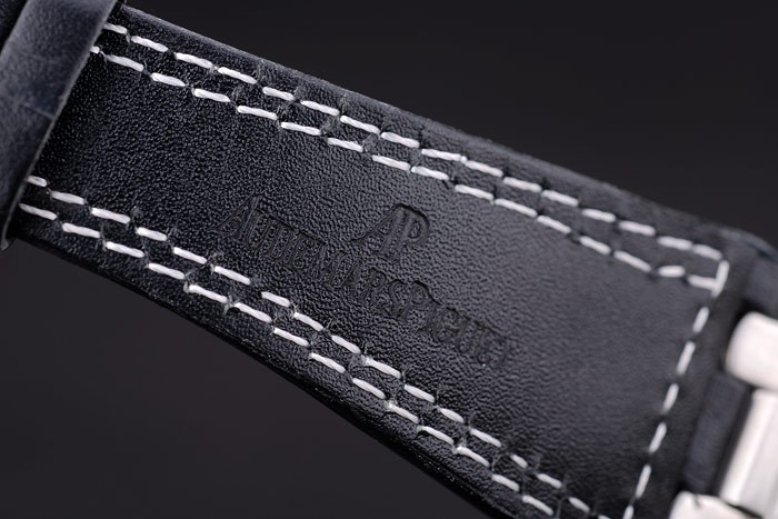 Case: csiszolt rozsdamentes acél tok katalógusa szíj: Heat dombornyomott Audemars Piguet svájci Made logó és fekete bőr szíjjal dupla fehér varrócérna és Audemars Piguet gravírozott rozsdamentes acél horog csattal csattal katalógusa karkötő hossza: 188 x 29 mm katalógusa Keret: ion- Crafted Down Betel