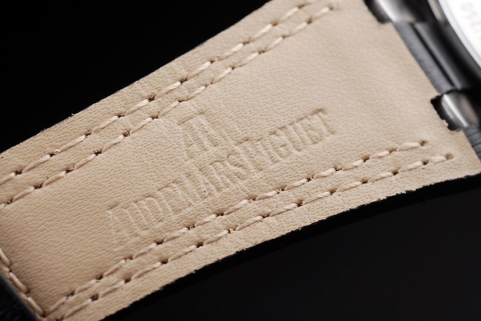 Case: Ion bevont rozsdamentes acél tok katalógusa szíj: Heat dombornyomott Audemars Piguet fekete krokodil bőrszíj dupla fehér varrással és Audemars Piguet gravírozott rozsdamentes acélból készült szétnyitható a kapocs katalógusa karkötő hossza: 215 x 28 mm katalógusa Keret: szálcsiszolt rozsdamentes acél csavaros Beszel