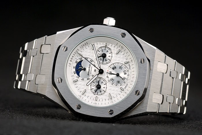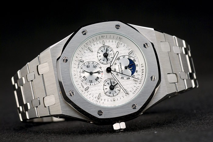 Case: csiszolt rozsdamentes acél tok katalógusa Szíj: szálcsiszolt rozsdamentes acél link karkötő AP gravírozás és nyomógombos csattal rejtett katalógusa karkötő hossza: 165 x 25 mm katalógusa keret: nyolcszögletű szálcsiszolt rozsdamentes acél csavaros előlap katalógusa sáv típusa: Rozsdamentes acél katalógusa Átmérő: 40 x 49 mm-es katalógusa Üveg: zafír kristály katalógusa Crown: Rozsdamentes acél Audemars Piguet logo vésett hatszögletű korona katalógusa Case Vastagság: 13 mm Matton
