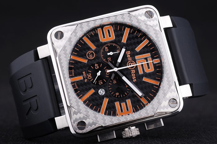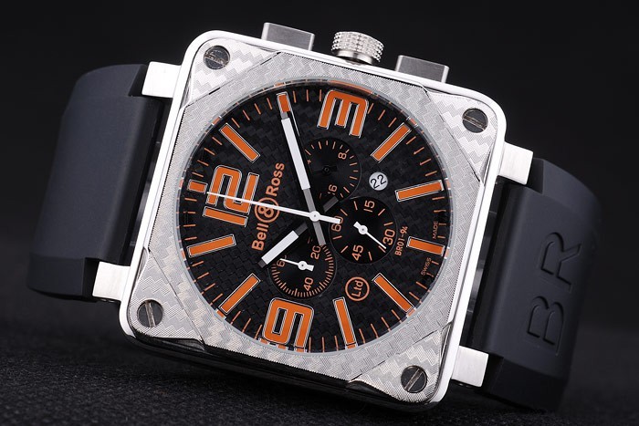 Case: Polírozott rozsdamentes acél tok > szíj: Heat dombornyomott Bell & Ross logó és a termék kódja fekete gumi heveder BR feliratos csiszolt rozsdamentes acél horog-csattal csattal