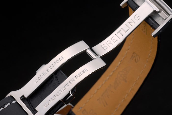 karkötő: Breitling Heat dombornyomott fekete krokodil bőr heveder fehér menetes varrással és logó gravírozott polírozott rozsdamentes acél hajtogatott kötlevel