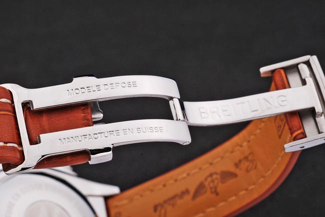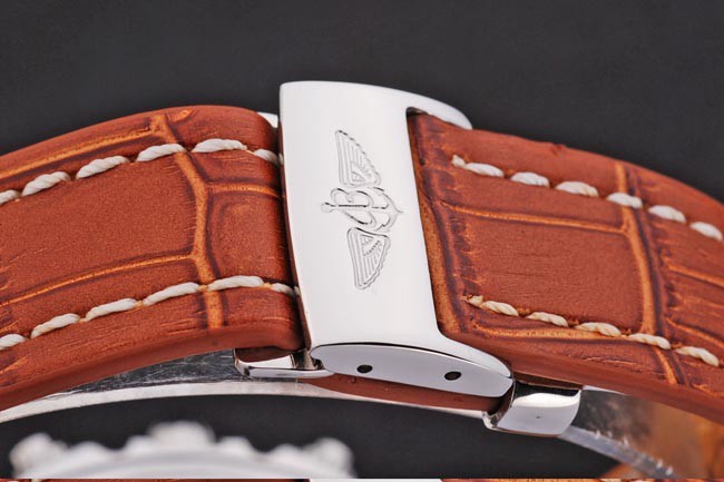 karkötő: Russet piros magas minőségű bőr krokodilszerű mintában, nehéz fehér pamut varrással. A belső zenekar dombornyomott a Breitling nevével és logójával, és acélcsatlakozója van.
