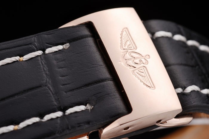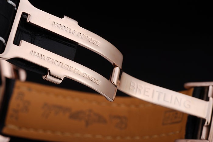 Case: 18k Rose-Gold Pled esetében katalógusa szíj: Heat dombornyomott Breitling név és logó fekete krokodil bőrszíj fehér cérnával stiching és vésett logó rózsa-aranyozott kinyitható zárral katalógusa karkötő hossza: 210 x 24 mm katalógusa Keret: 18k rózsa arany Corning Crown Crown