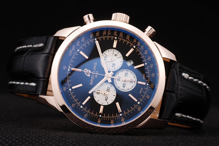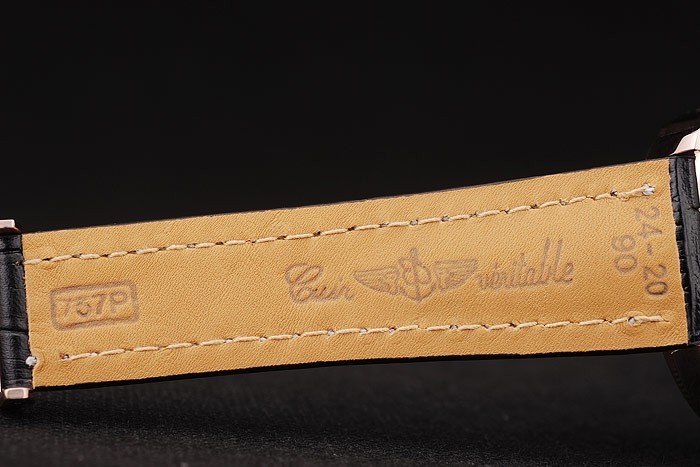 karkötő: hő dombornyomott Breitling fekete krokodil bőr heveder fehér menetes varrással és egy gravírozott logó gravírozott rózsa-aranyozott kötés