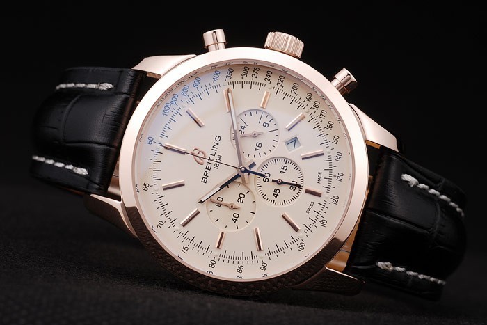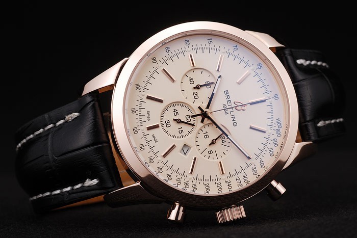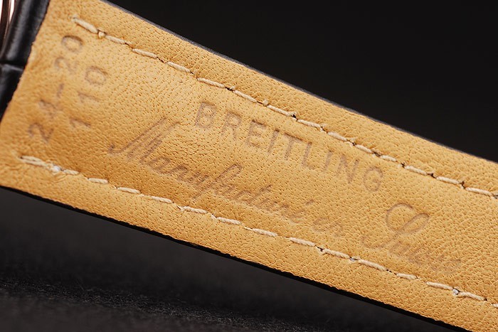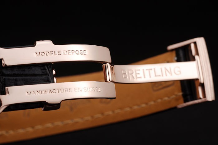karkötő: hő dombornyomott breitling fekete krokodil bőr heveder fehér menetes varrással és egy breitling logó gravírozott hajtás – rózsa-arany bevonattal