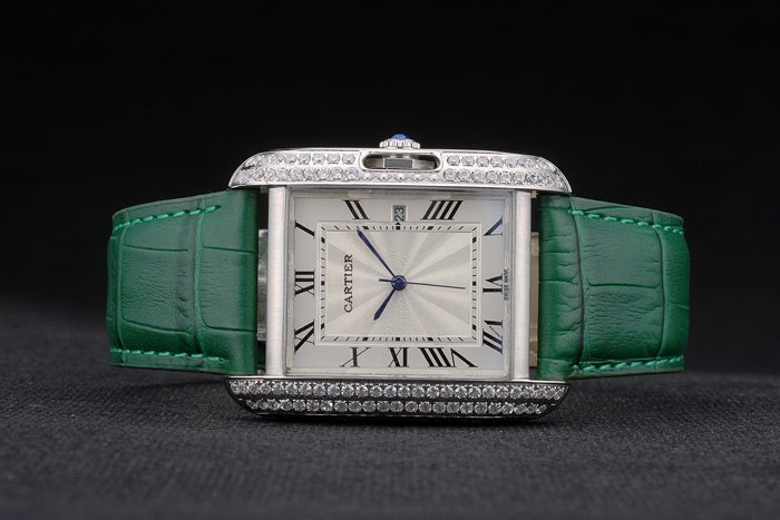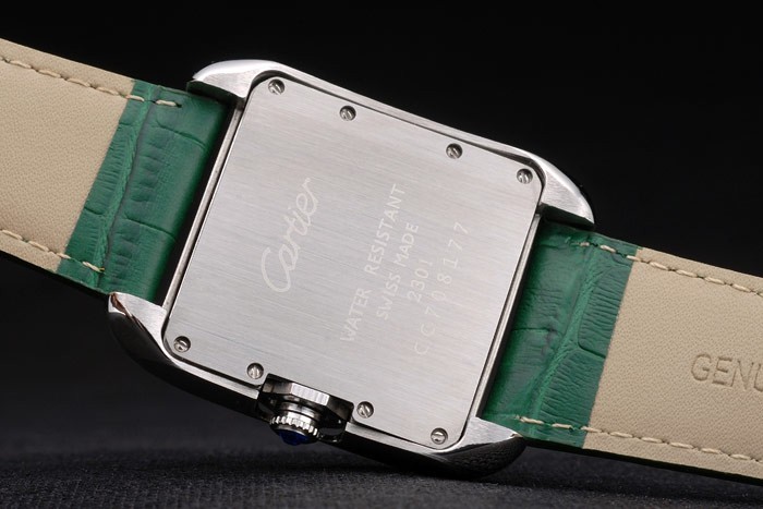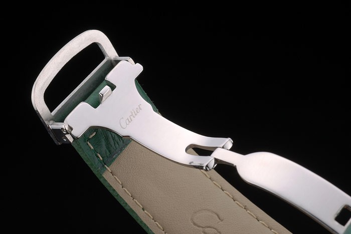 karkötő: Cartier Hő dombornyomott zöld krokodil bőr szíj polírozott rozsdamentes acélból készült szétnyitható a kapocs csat katalógusa karkötő hossza: 205 x 25 mm katalógusa keret: fehér kristály csap polírozott rozsdamentes acél lünetta niched korona katalógusa Átmérő: 48 x 36 mm