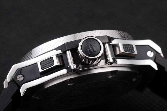 korona: vágás polírozott rozsdamentes acél korona ‘h’ gravírozással és két téglalap alakú nyomógomb koronával mindkét oldalon , mindannyian fekete gumi díszítéssel vannak ellátva