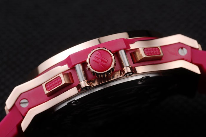 Crown: cutwork rose-arany korona ‘H’ Gravírozás és két téglalap alakú nyomógombos koronák mindkét oldalon, mindegyike rózsaszín gumi díszítéssel