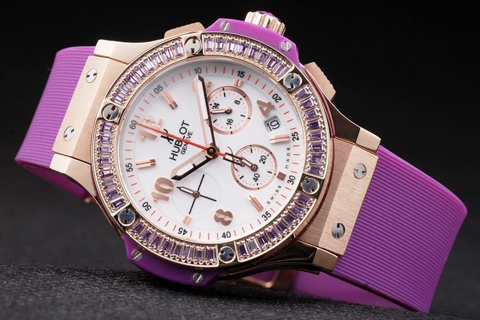 Case: Polírozott 18k rózsa aranyozott rozsdamentes acél tok : texturált lila gumiszalag rose-gold nyomógombos csattal horog és Hublot metszetek katalógusa karkötő hossza: 160 x 21 mm katalógusa keret: lila kristály kivert csiszolt 18k rose-gold becsavarva előlap katalógusa sáv Típus: gumi