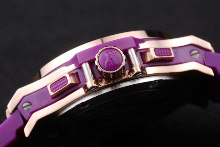 korona: vágás rózsa-arany korona ‘h’ gravírozás és két téglalap alakú nyomógomb koronák mindkét oldalán, mindegyike lila gumi díszítéssel