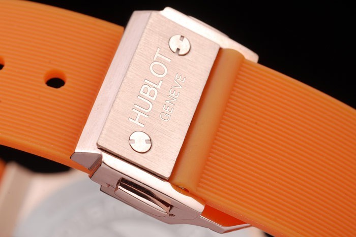 Case: Polírozott 18k Rose aranyozott rozsdamentes acél tok katalógusa Szíj: textúrájú narancssárga gumiszalagot rose-gold nyomógombos csattal horog és Hublot metszetek katalógusa karkötő hossza: 160 x 21 mm katalógusa keret: Orange kristály kivert csiszolt 18k rose-gold becsavarva keret < br> sáv típusa: Rubber