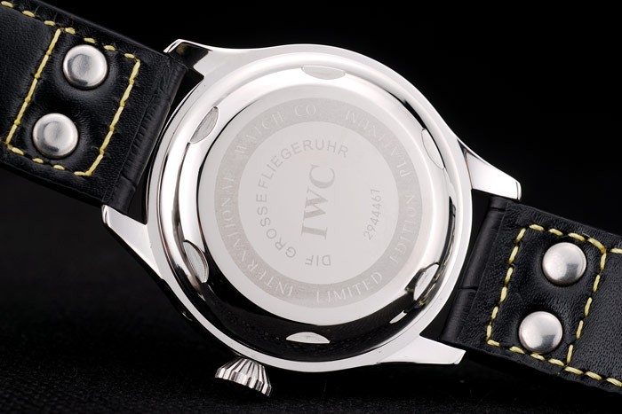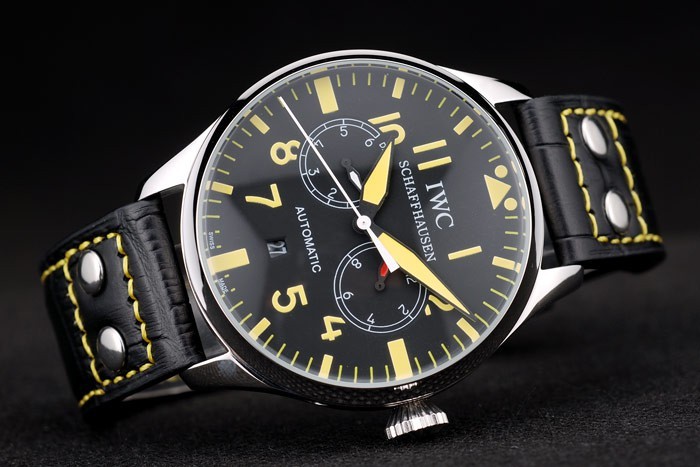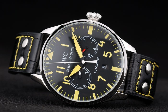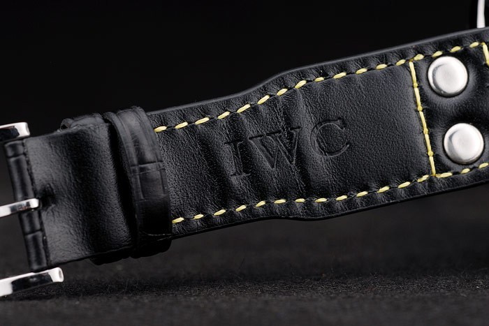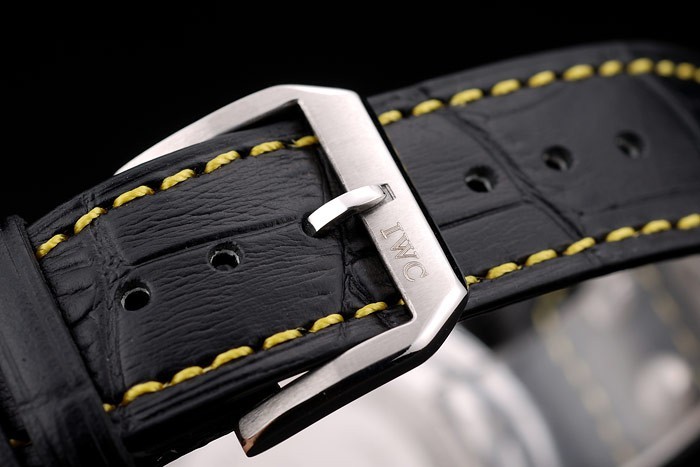 Case: Csiszolt rozsdamentes acél tok br> szíj: IWC hő dombornyomott fekete krokodil bőr szíj sárga szál varrás és vésett csiszolt rozsdamentes acél horog-IWC csattal