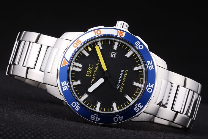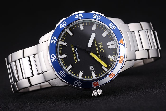 Case: polírozott rozsdamentes acél tok > Szíj: rozsdamentes acél link karkötő feliratú IWC rejtett kapocs katalógusa karkötő hossza: 200 x 22 mm katalógusa keret: Kék zománcozott polírozott rozsdamentes acél lünetta cutwork perc markerek katalógusa sáv Típus: rozsdamentes acél katalógusa Átmérő: 54 x 46 mm
