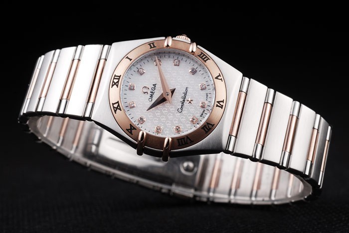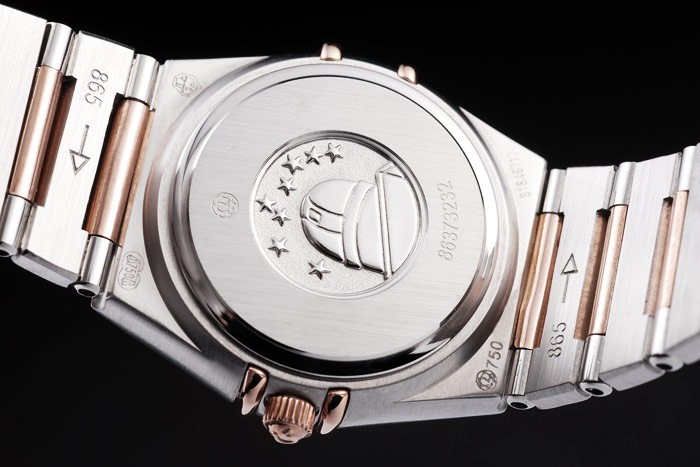 zenekar típusa: rozsdamentes acél átmérő: 26 x 25 mm-es katalógusa Watch Kapcsos: Flip csat katalógusa Üveg: zafír kristály katalógusa Crown: 18k rose-gold cutwork korona Omega logo katalógusa Case vastagság: 8 mm Matton