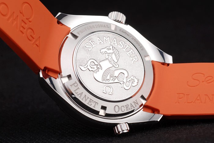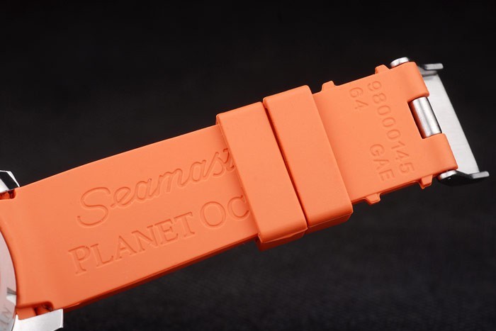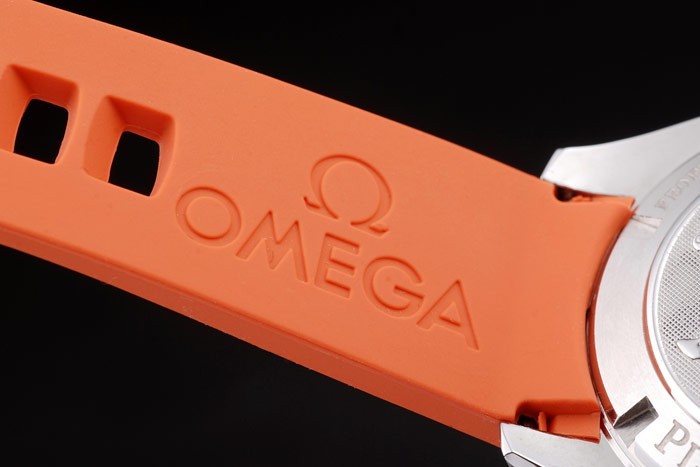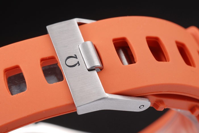 karkötő: narancssárga gumi heveder omega bélyegzővel és csiszolt rozsdamentes acél horog-csattal csatolva az omega logóval a tetején