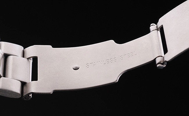 korona: polírozott rozsdamentes acél vágás korona omega logóval és két további koronával, az egyik mindkét oldalán, az eset vastagsága: 15 mm