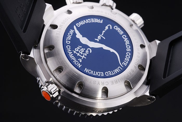 átmérő: 54 x 45 mm-es katalógusa Watch Kapcsos: Biztonsági csat katalógusa Üveg: zafír kristály katalógusa korona: Orange zománc polírozott rozsdamentes acél cutwork korona jobb felső plusz egy Oris vésett cutwork korona, két szeder cutwork korona két oldalán az ellenkező oldalon