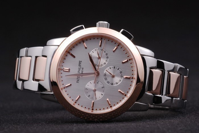 Case: Polírozott rozsdamentes acél tok Szíj: rozsdamentes acél és arany rózsa link karkötő rejtett kapocs és Patek Philippe jelölés katalógusa karkötő hossza: 186 x 20 mm katalógusa keret: 18k rózsa arany lünetta katalógusa sáv Típus: rozsdamentes acél katalógusa Átmérő: 48 X 40 mm