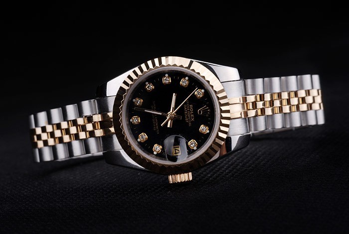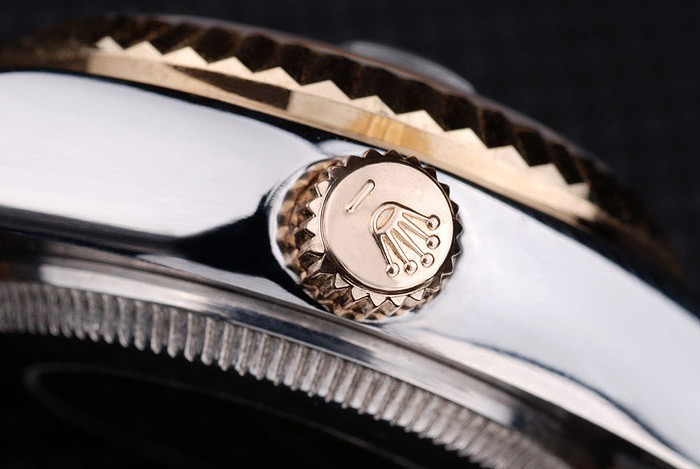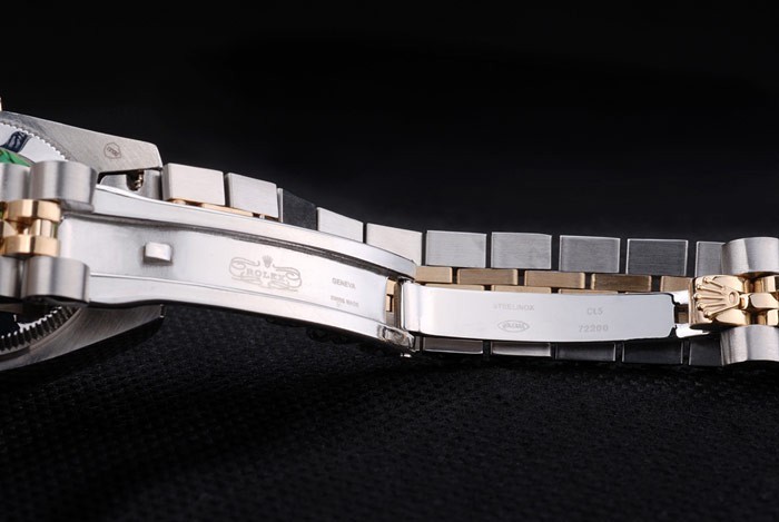 A Rolex Datejust a legjobb minőségű replika órák között van. Háromsoros acélból készült, zöld Rolex logóval bélyegzett hátlappal. Női modell. Japán Miyota mozgással szerelt. Csiszolt, rozsdamentes acél tok. Két tónusú láncszemes karkötő csiszolt, rozsdamentes acélból és 18 karátos, sárgaarany bevonattal. Rejtett kapocs Rolex logóval. A karkötő hossza 190 x 13 mm, szélessége 26 mm. Az előlap 18 karátos, sárgaarany bevonatú, rozsdamentes acélból, cutwork technikával készült. A szíj rozsdamentes acélból készült. Az óra mérete 34 x 26 mm, vastagsága 13 mm. Flip csat. Zafír üveg. A korona 18 karátos, sárgaarany bevonatú acélból készült, cutwork Rolex logóval.