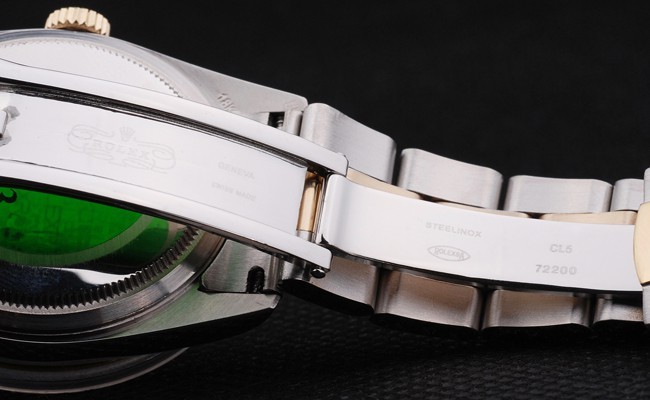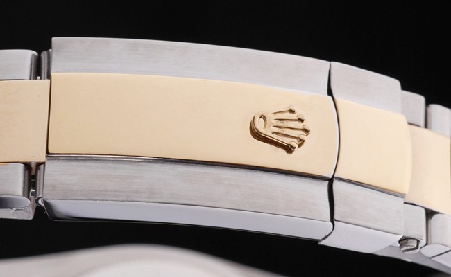 karkötő: Két tónusú link karkötő csiszolt rozsdamentes acél és 18 k sárga aranyozott acél rolex gravírozás hajtogatott – a telepítési clasp bemutatja a Rolex logót