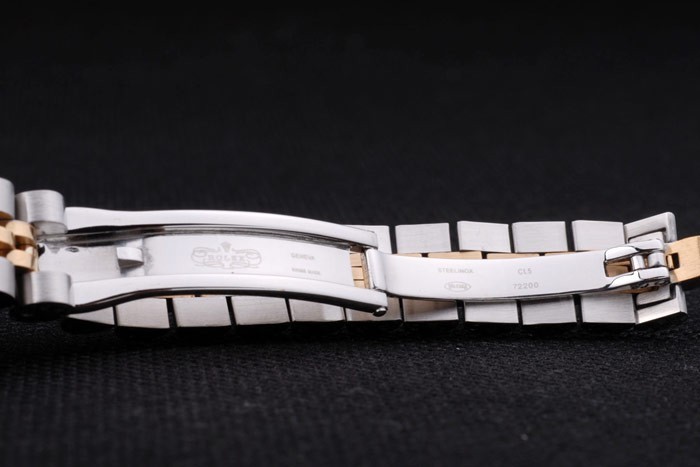 karkötő: két tónusú link karkötő csiszolt rozsdamentes acél és 18k sárgaarany bevont acél Rolex metszés rejtett kapocs megjelenítésére Rolex logo katalógusa karkötő hossza: 190 x 13 mm katalógusa keret: 18k sárga arany bevonatú rozsdamentes acél előlap cutwork katalógusa zenekar Típus: rozsdamentes acél