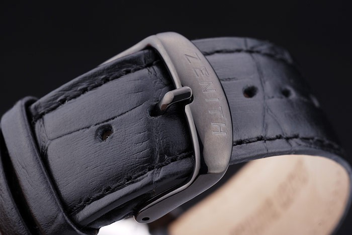átmérő Skin: 49 x 42 mm-es katalógusa Watch Kapcsos: Buckle katalógusa Crown: Ion bevont cutwork korona Zenith csillag embléma gravírozás, és két kisebb kerek nyomógombos korona két oldalán azt katalógusa Case Vastagság: 12 mm
