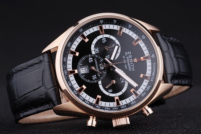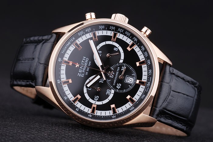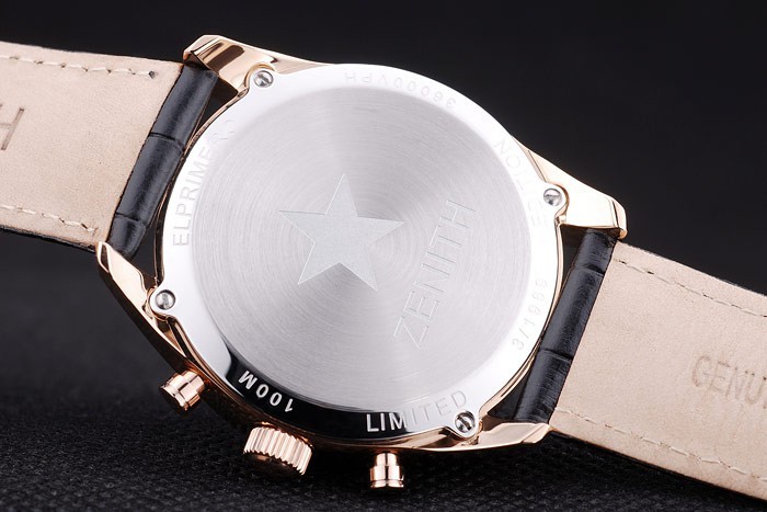 Crown: Rose-aranyozott vágás korona Zenith csillag logó gravírozás és két kisebb kerek nyomógomb koronák mindkét oldalon Case vastagság: 12 mm