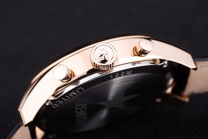 Crown: Rose-aranyozott vágás korona Zenith csillag logó gravírozás és két kisebb kerek nyomógomb koronák mindkét oldalon Case vastagság: 12 mm